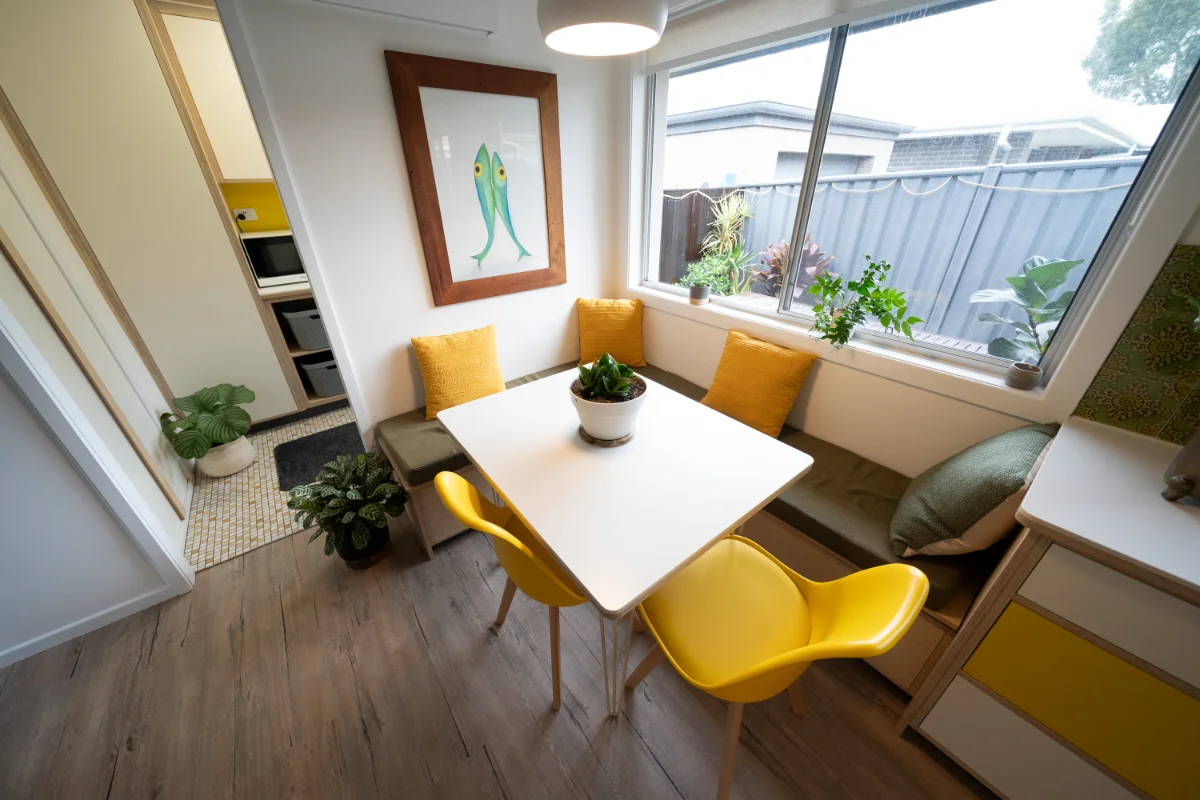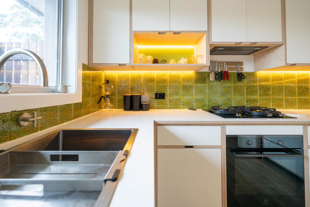 From the sunny golden uppers to Juicy green pops, warm lighting and fingerpull detailing, this kitchen, dining and laundry makeover is a nostalgic nod to the past, reimagined for modern life.