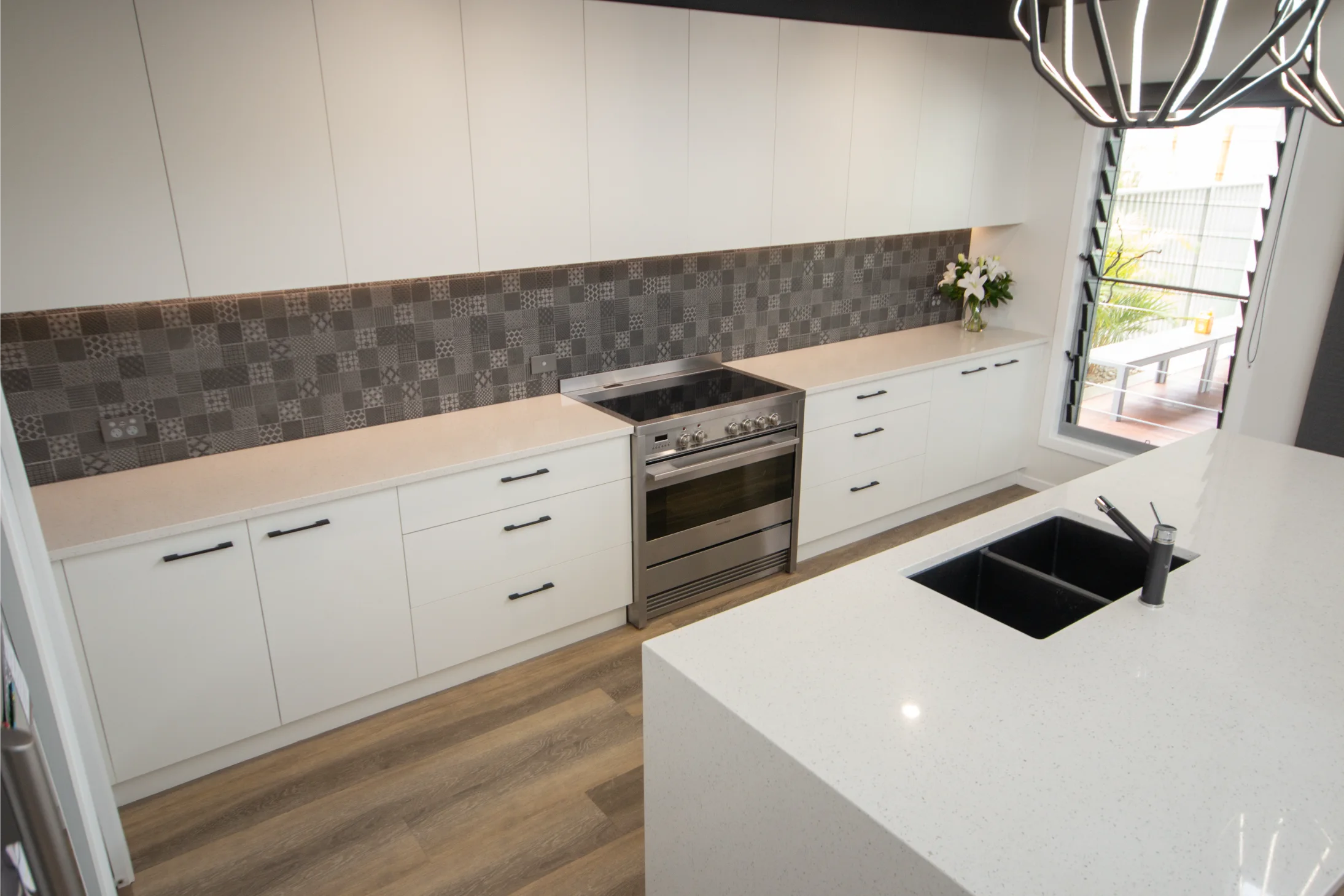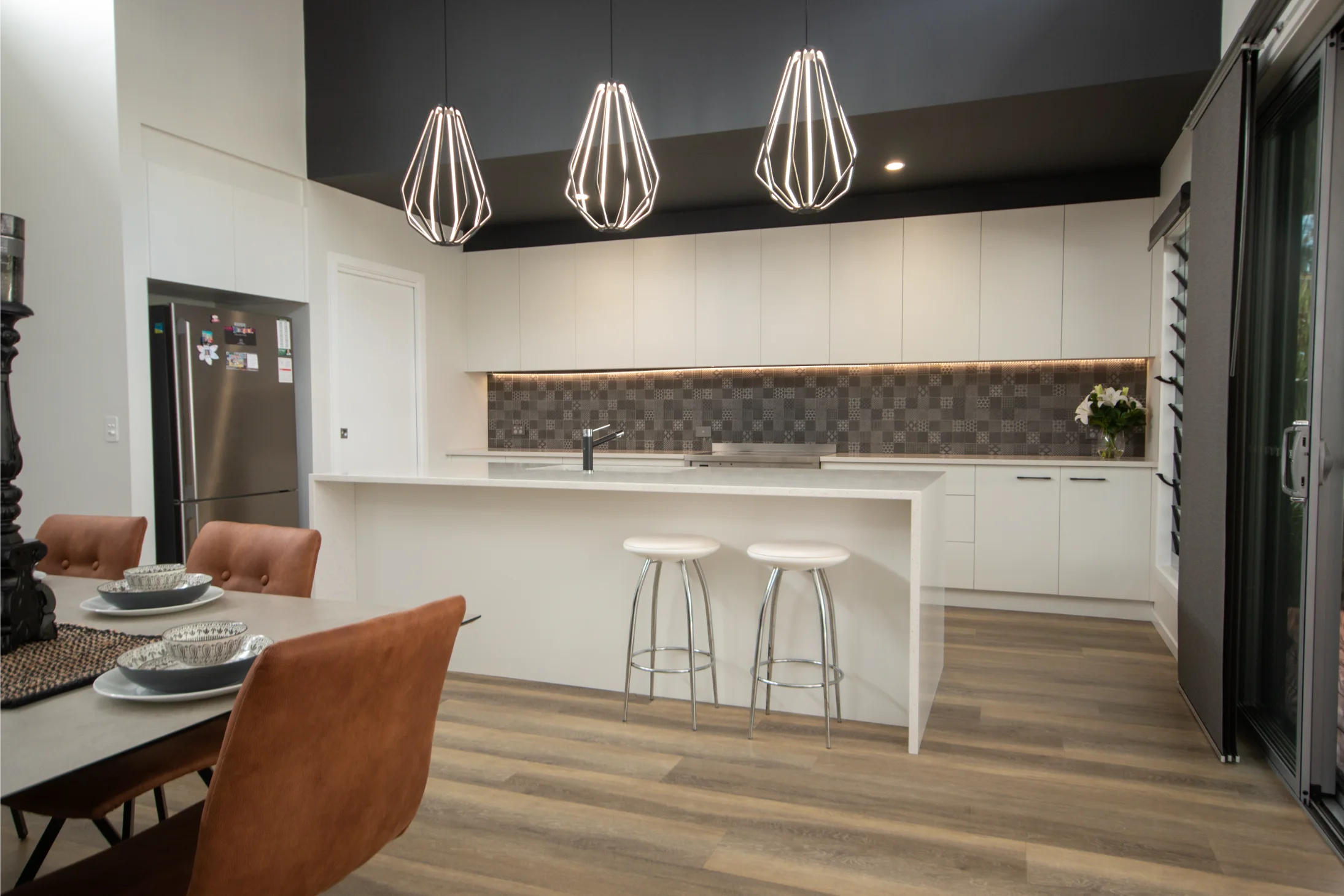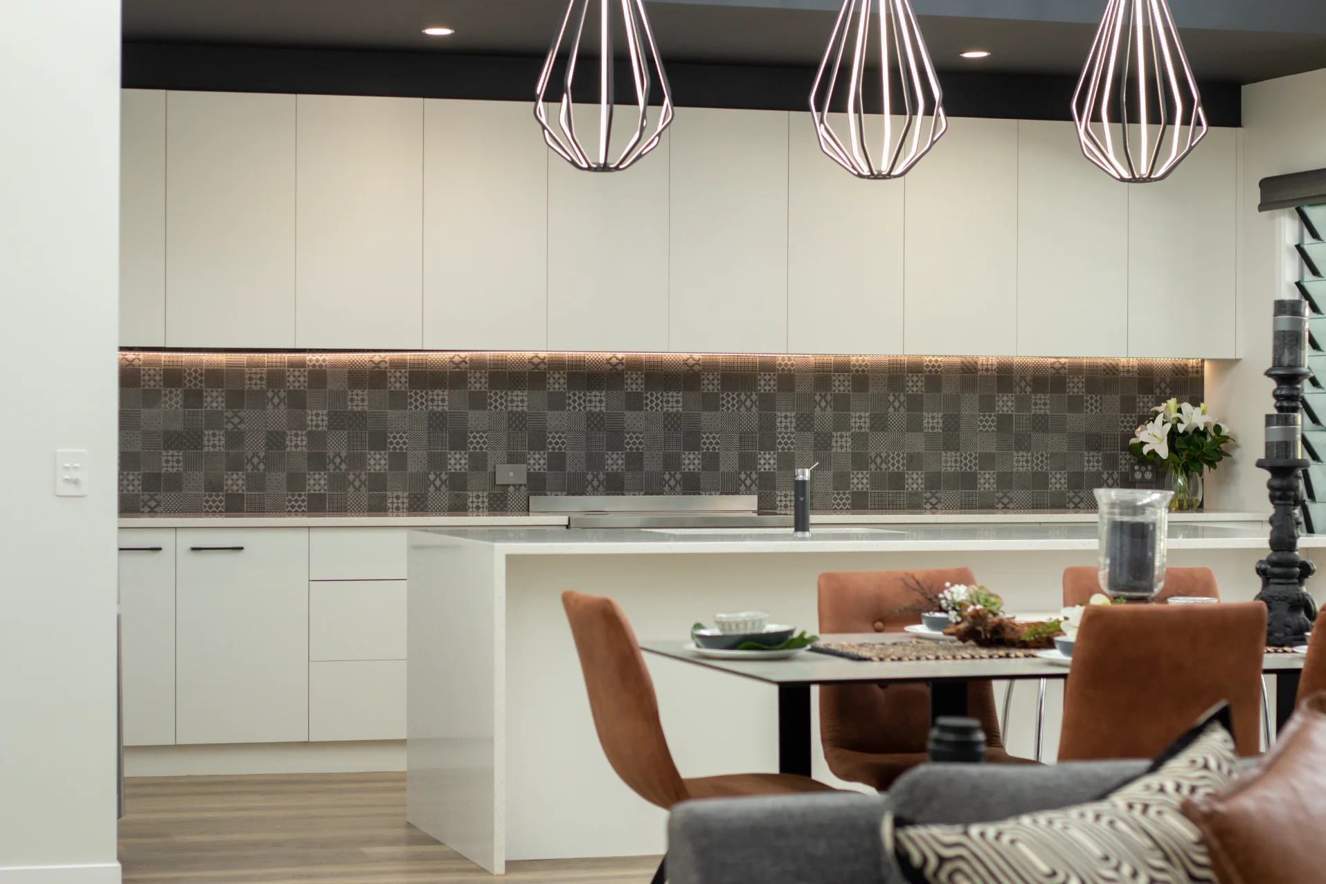 Designed and crafted by Sawtell Kitchens, this space features tailor-made joinery that highlights statement pieces throughout the home. The kitchen’s balanced layout, moody splash back, and tonal finishes in the blinds and roofline create a seamless connection with the rest of the house.