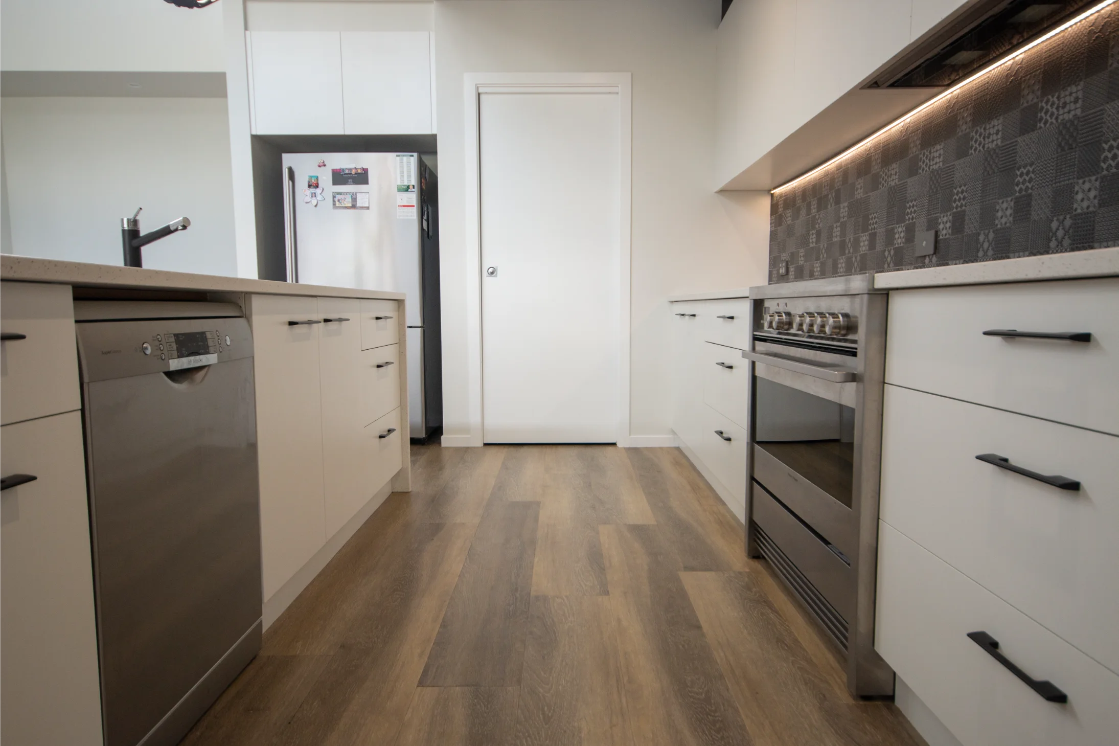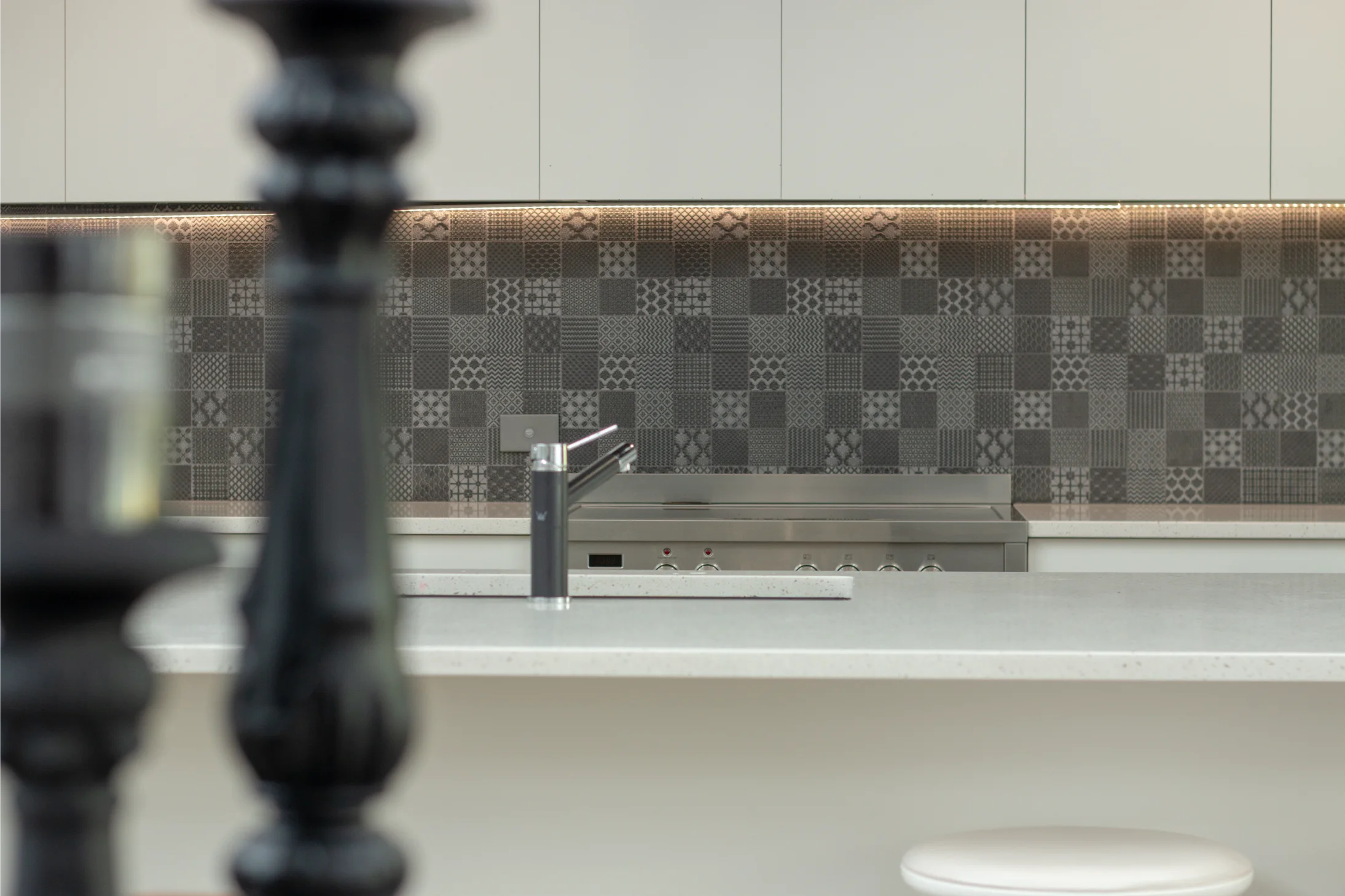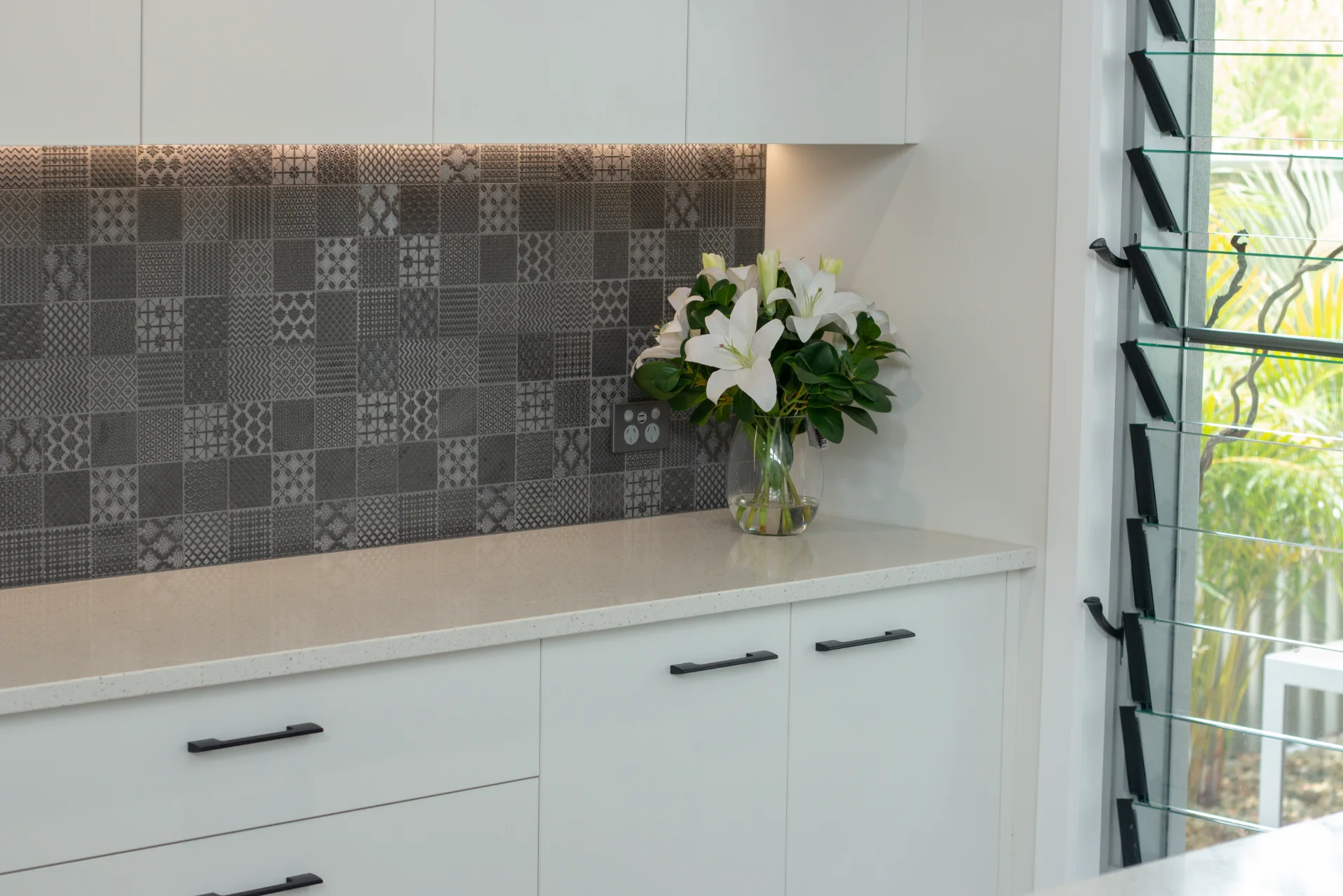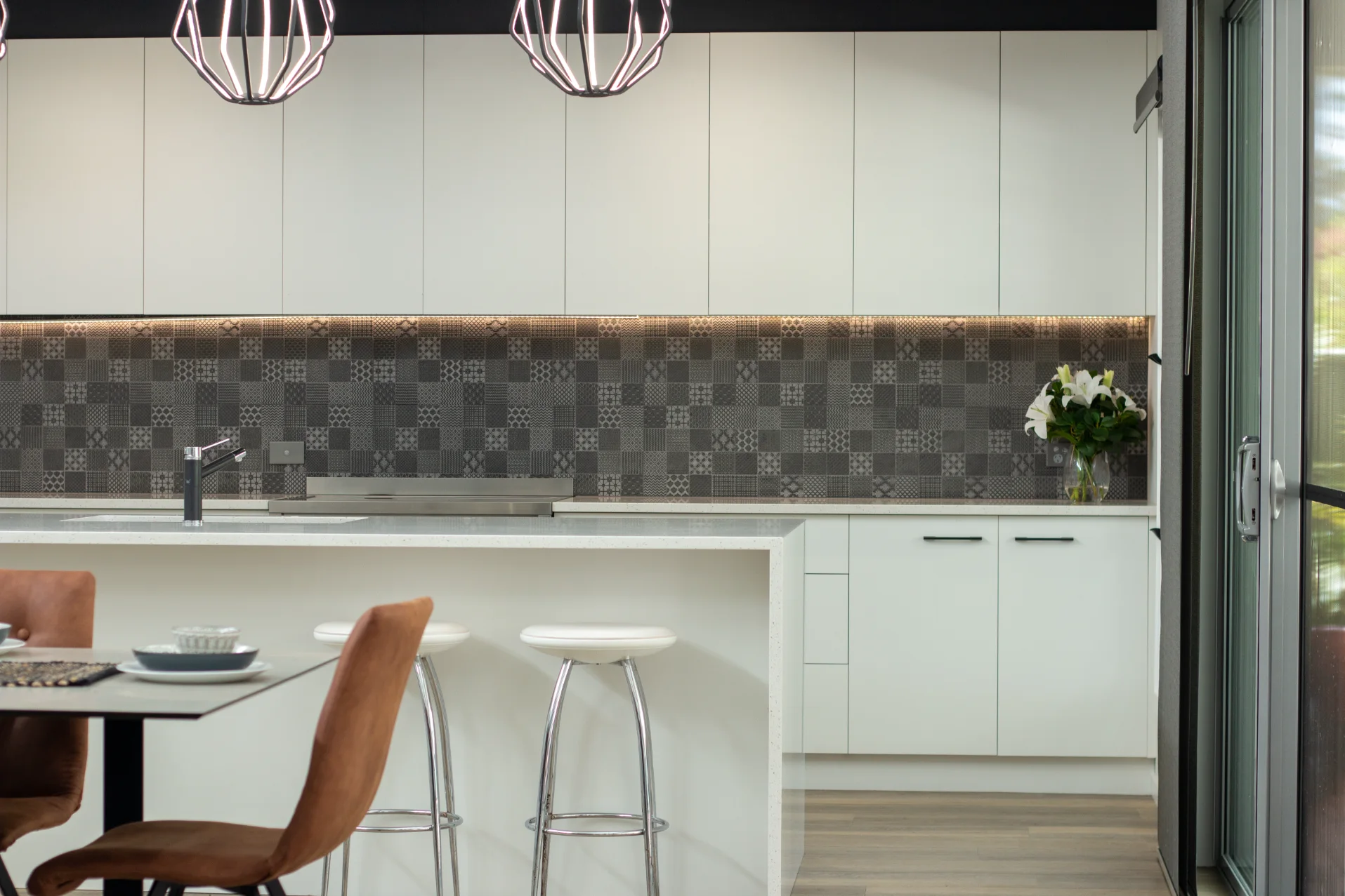 Designed and crafted by Sawtell Kitchens, this space features tailor-made joinery that highlights statement pieces throughout the home. The kitchen’s balanced layout, moody splash back, and tonal finishes in the blinds and roofline create a seamless connection with the rest of the house.